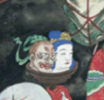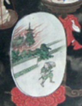 また、地蔵菩薩を本地とする五七日の閻魔王は、俱生神(くしょうじん)からの報告を浄玻璃(じょうはり)の鏡に映し出させ、それを判断材料にして、亡者の審理と裁判を行います。俱生神は、人が生まれると同時に生まれ、常にその人の両肩に乗って全ての行為を記録します。右肩に乗って悪行ばかりを記録する女神を同生(どうしょう)、左肩に乗って善行ばかりを記録する男神を同明(どうみょう)と呼びます。下の絵で鏡に映し出されているのは、亡者が生前に大きな建物に火を放ったか、火事場泥棒をしているかにも見えます。