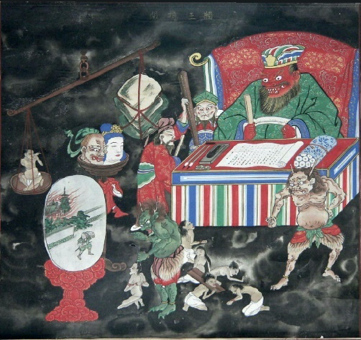 十王信仰は中国で仏教と道教が習合し、成立しました。日本では鎌倉時代に十王と十仏が相対させられ、江戸時代に十三仏信仰に発展していきます。死後において繰り返しお裁きを受けたり、仏様にお救い頂いたりしながら、六道輪廻の転生先が決まるという思想です。いわば、十王が裁判官で、十仏が弁護人、遺族が証人です(検察は倶生神といったところでしょうか)。