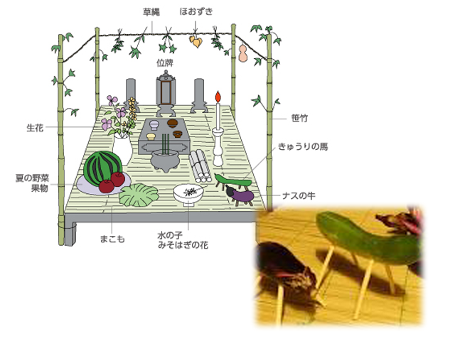 早く帰って来て欲しかったんですよ、という気持ちを表すのに、キュウリで馬の形を作り、お帰りの時は寂しいですから、ゆっくりお帰りくださいという気持ちをナスで作った牛で表現します。充分喜んでくださったら、きっと私たちをあの世から見守ってくださるに違いない。これで来年までの1年間は家族が息災に暮らせるというのです。