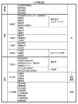 六道(地獄・餓鬼・畜生・修羅・人・天上)という生死を繰り返す迷いの世界を、欲界(よっかい)・色界(しきかい)・無色界(むしきかい)に大別して、これを三界といいます。この世界を超えたところに悟りの世界があります。