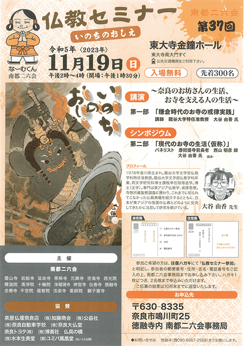 【日時】令和5年11月19日(日) 午後2:00〜4:00(開場 午後1:30)【会場】東大寺 金鐘ホール【参加費】入場無料(先着300名)【講演(第一部)】〜奈良のお坊さんの生活、お寺を支える人の生活〜「鎌倉時代のお寺の戒律実践」【シンポジウム(第二部)】「現代のお寺の生活(仮称)」【主催】南都二六会