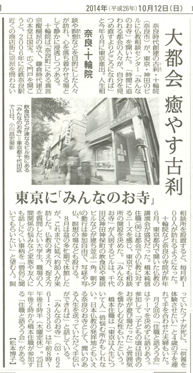 10月12日の毎日新聞 社会面に、東京のみんなのお寺が掲載されました。